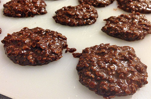 Use two tablespoons to form the cookies and drop onto wax paper. If you want to, you can lightly press the cookies on top to flatten them a little more into a cookie shape. Let the cookies cool. (Or, try a few while they are warm and gooey!)