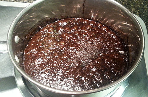 Over medium heat, bring just to a slow boil the sugar, cocoa, milk and butter. Stir mixture every few seconds to prevent clumping and burning on the bottom.